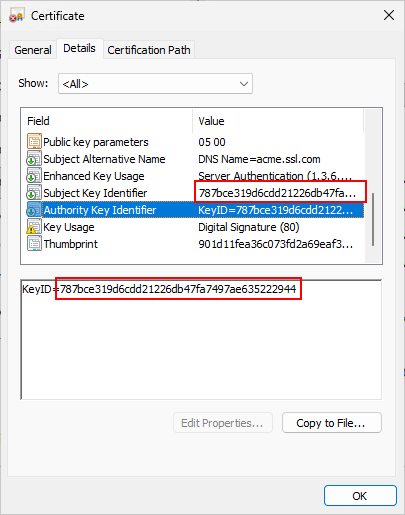 - SubjectKeyIdentifier (SKI) Erweiterung des Zertifikats (*)